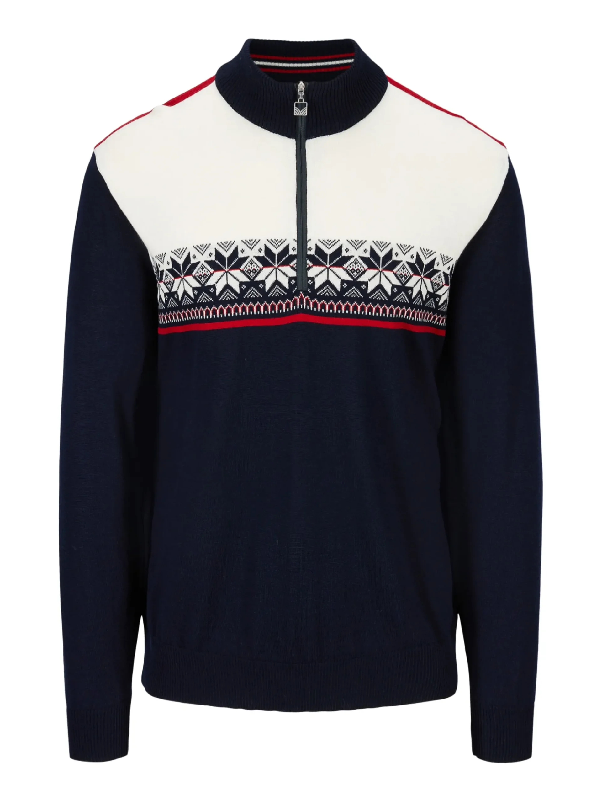 En Sporty, Lett Og Myk Merino Ullgenser Med Blokkfarger Og Monster Med Den Klassiske Attebladrosen. Genseren Har HalvHøy Hals Med Glidelas Og Kan Brukes Bade Som En Fritidsgenser Og Til Sportslige Aktiviteter.