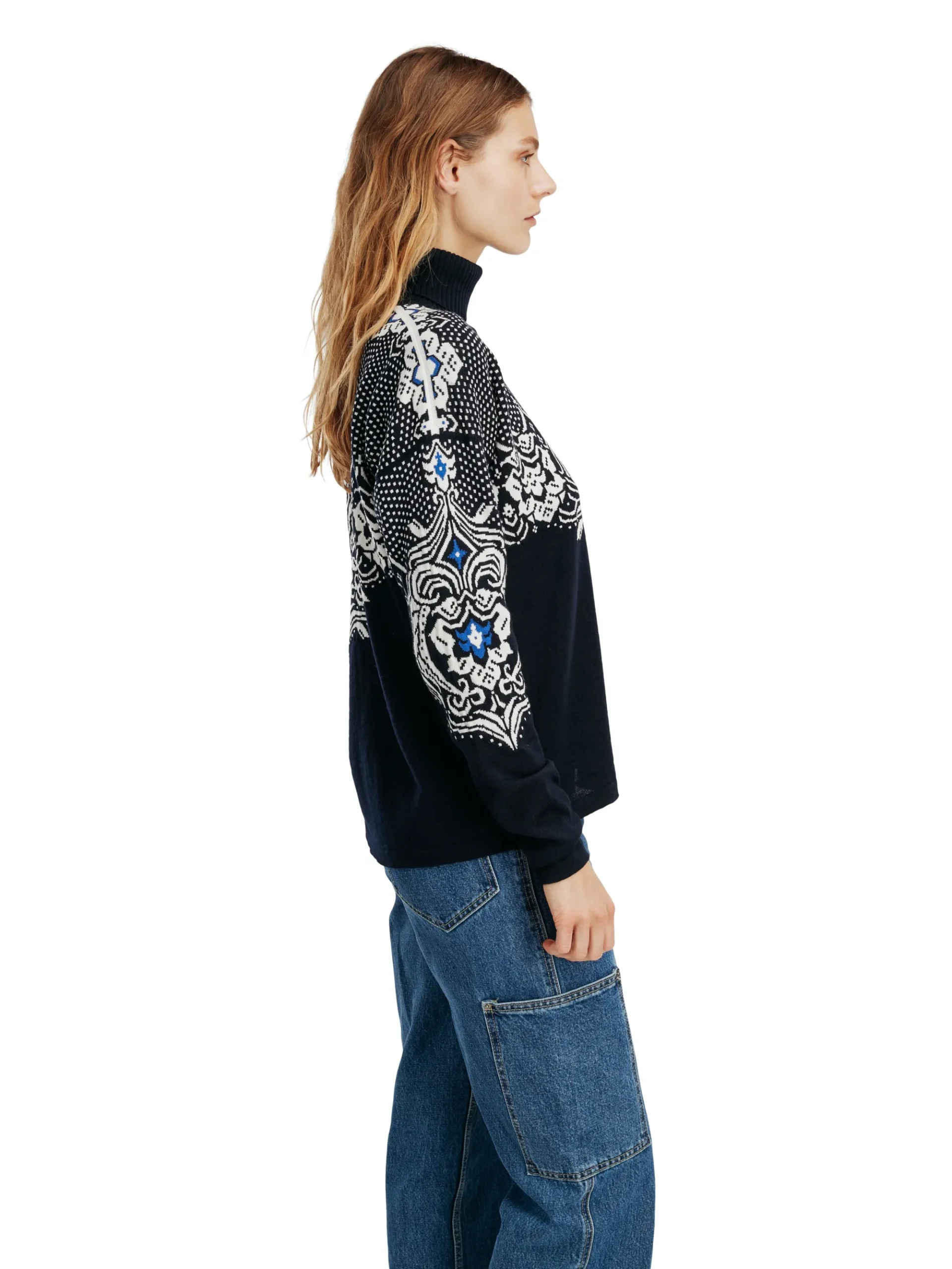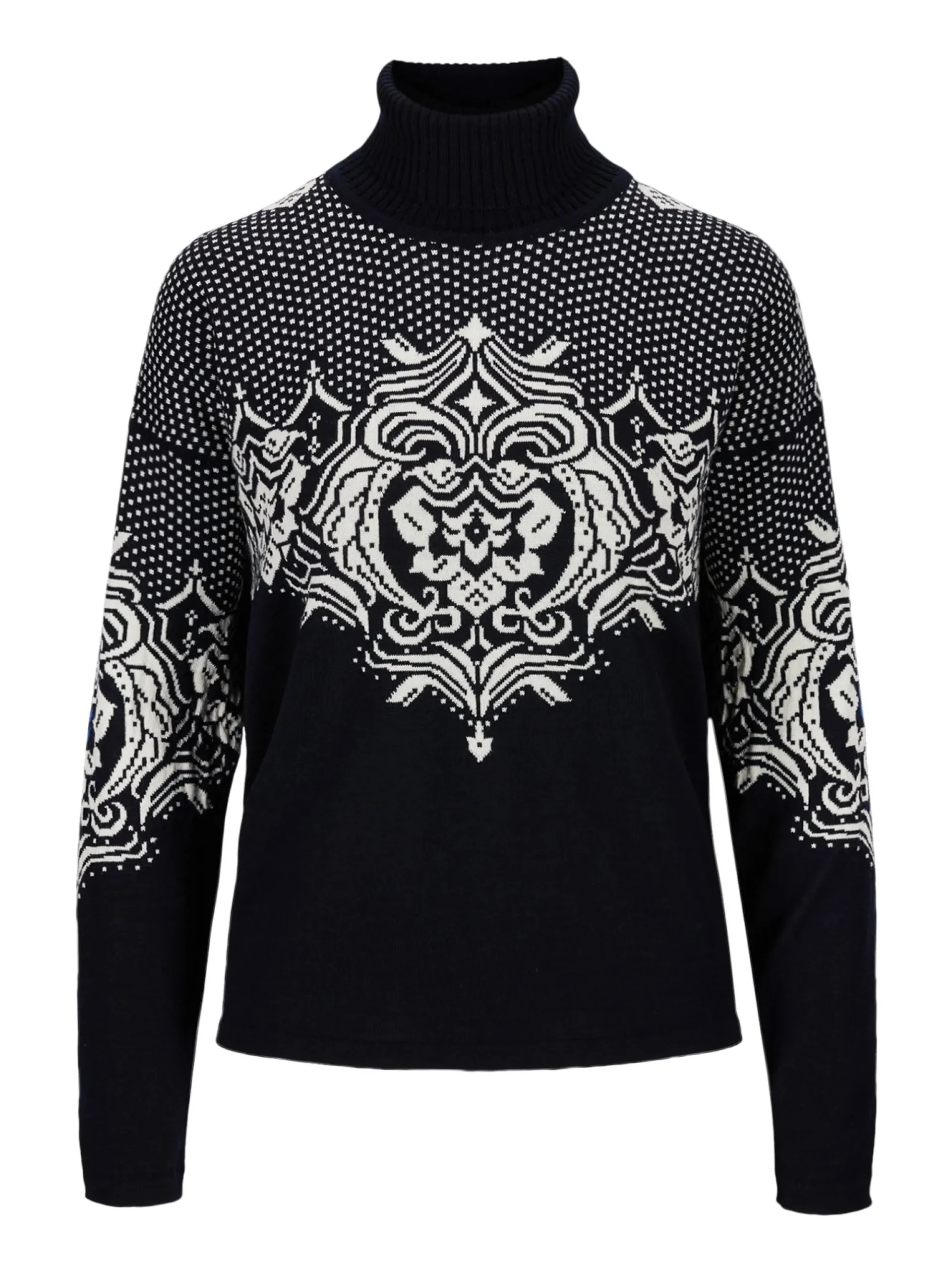 En Myk Og Svaert Tynn Ullgenser I 100% Merino-Ull, Med Høy Hals I Ribbestrikk. Det Detaljerte Blomstermonsteret Er Basert Pa Gamle Dalemonstre, Kombinert Med Lusemonster Pa Skuldrene.