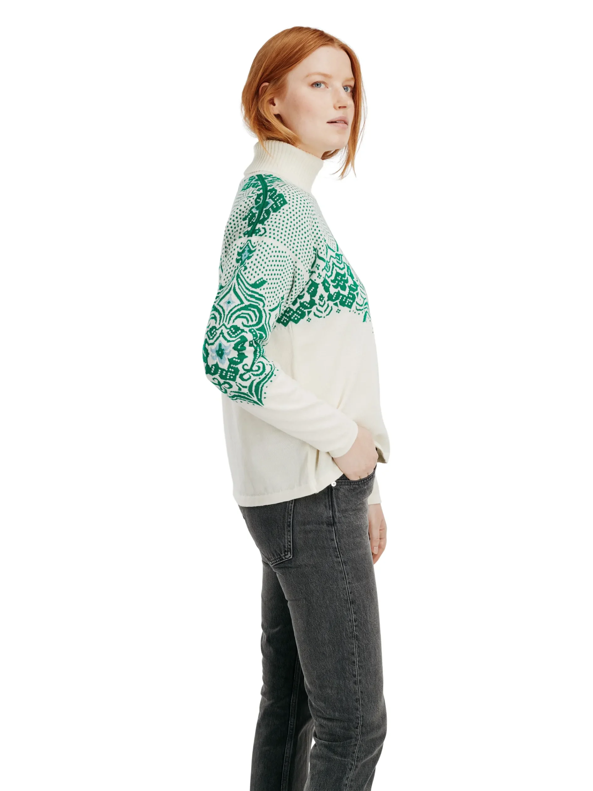 En Myk Og Svaert Tynn Ullgenser I 100% Merino-Ull, Med Høy Hals I Ribbestrikk. Det Detaljerte Blomstermonsteret Er Basert Pa Gamle Dalemonstre, Kombinert Med Lusemonster Pa Skuldrene.