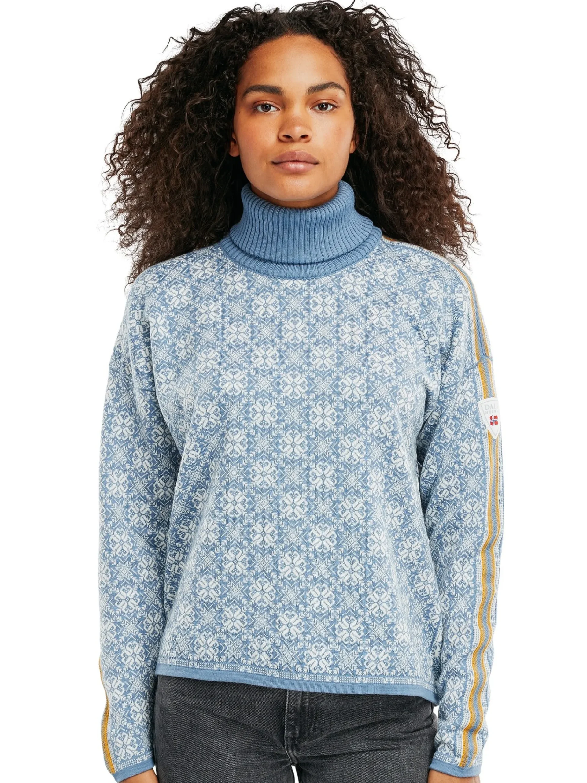Dette Er En Nytolkning Av Var Sporty Frida Jakke: En Avslappet, Hoyhalset Ullgenser Med En Oppdatert Og Vid Passform. Genseren Har En Noe Lenger Rygg Enn Front. Det Heldekkende Monsteret Er Uendret, Bestaende Av En Avrundet Variant Av Den Tradisjonelle Attebladrosen.