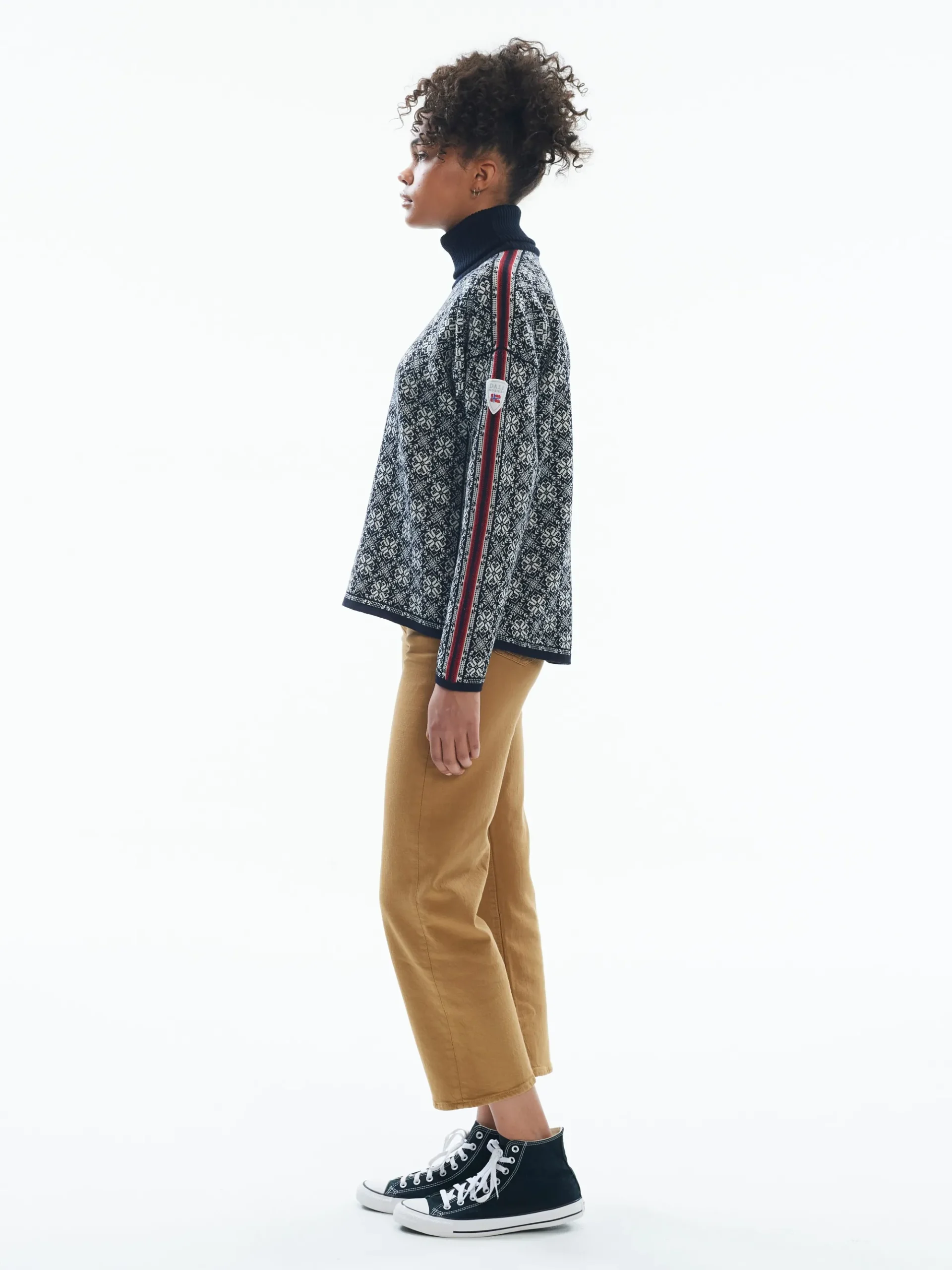 Dette Er En Nytolkning Av Var Sporty Frida Jakke: En Avslappet, Hoyhalset Ullgenser Med En Oppdatert Og Vid Passform. Genseren Har En Noe Lenger Rygg Enn Front. Det Heldekkende Monsteret Er Uendret, Bestaende Av En Avrundet Variant Av Den Tradisjonelle Attebladrosen.