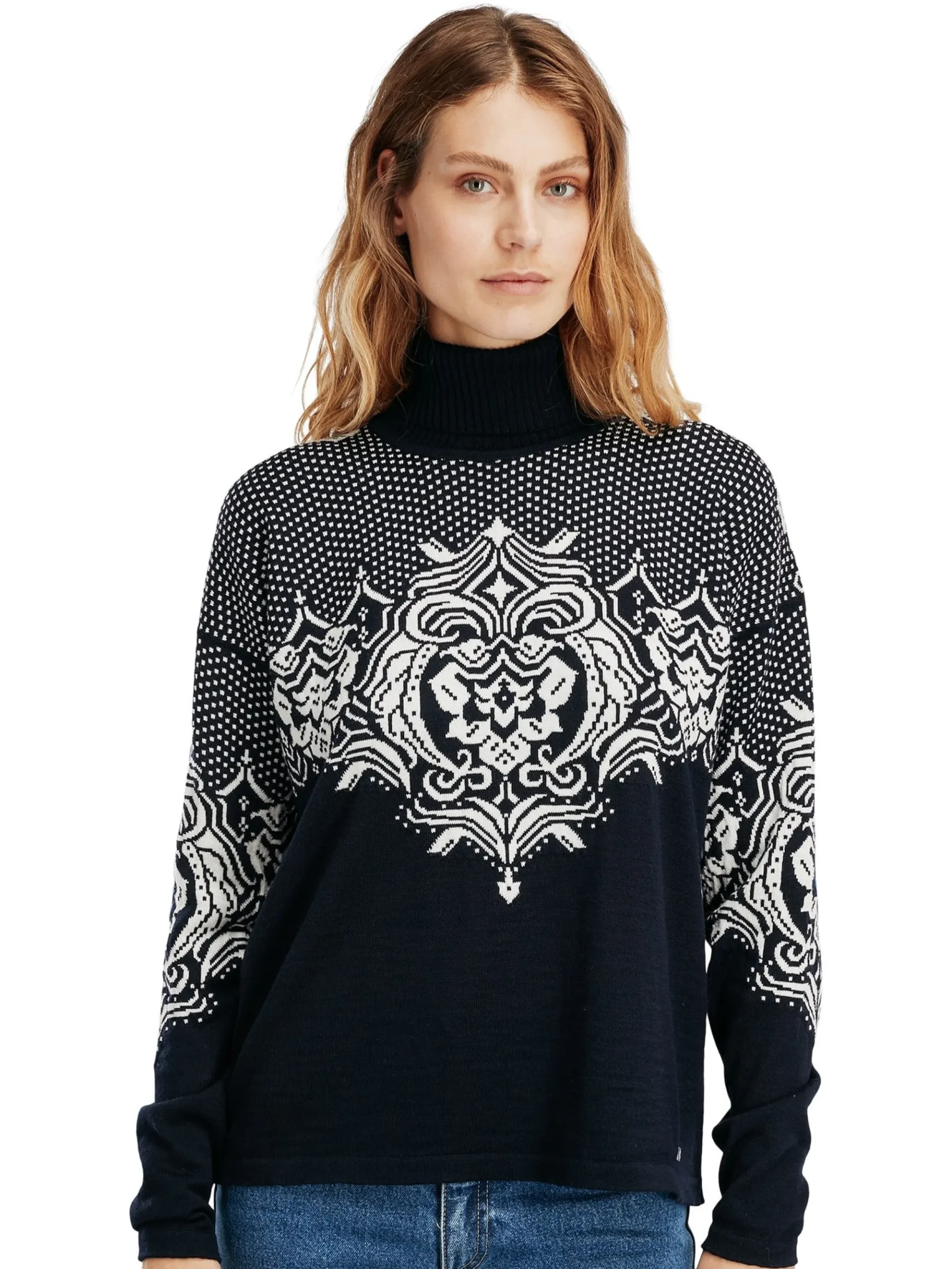 En Myk Og Svaert Tynn Ullgenser I 100% Merino-Ull, Med Høy Hals I Ribbestrikk. Det Detaljerte Blomstermonsteret Er Basert Pa Gamle Dalemonstre, Kombinert Med Lusemonster Pa Skuldrene.