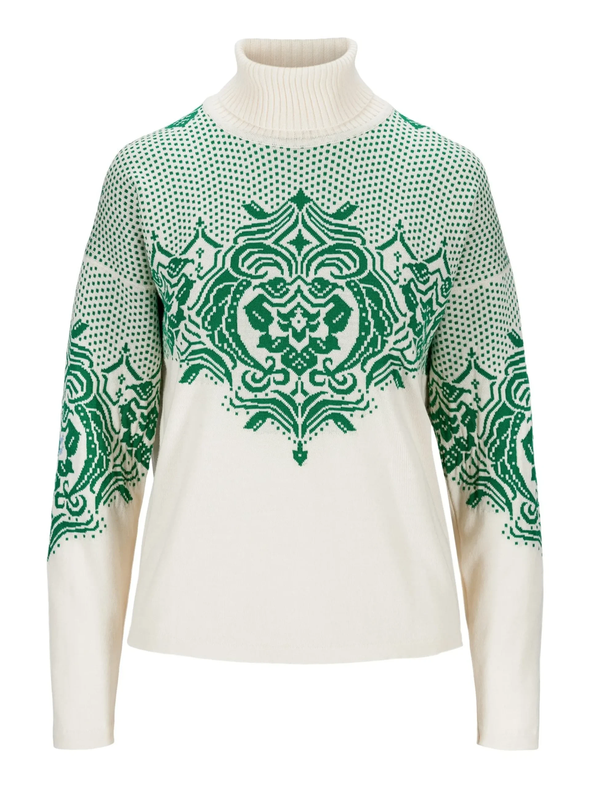 En Myk Og Svaert Tynn Ullgenser I 100% Merino-Ull, Med Høy Hals I Ribbestrikk. Det Detaljerte Blomstermonsteret Er Basert Pa Gamle Dalemonstre, Kombinert Med Lusemonster Pa Skuldrene.