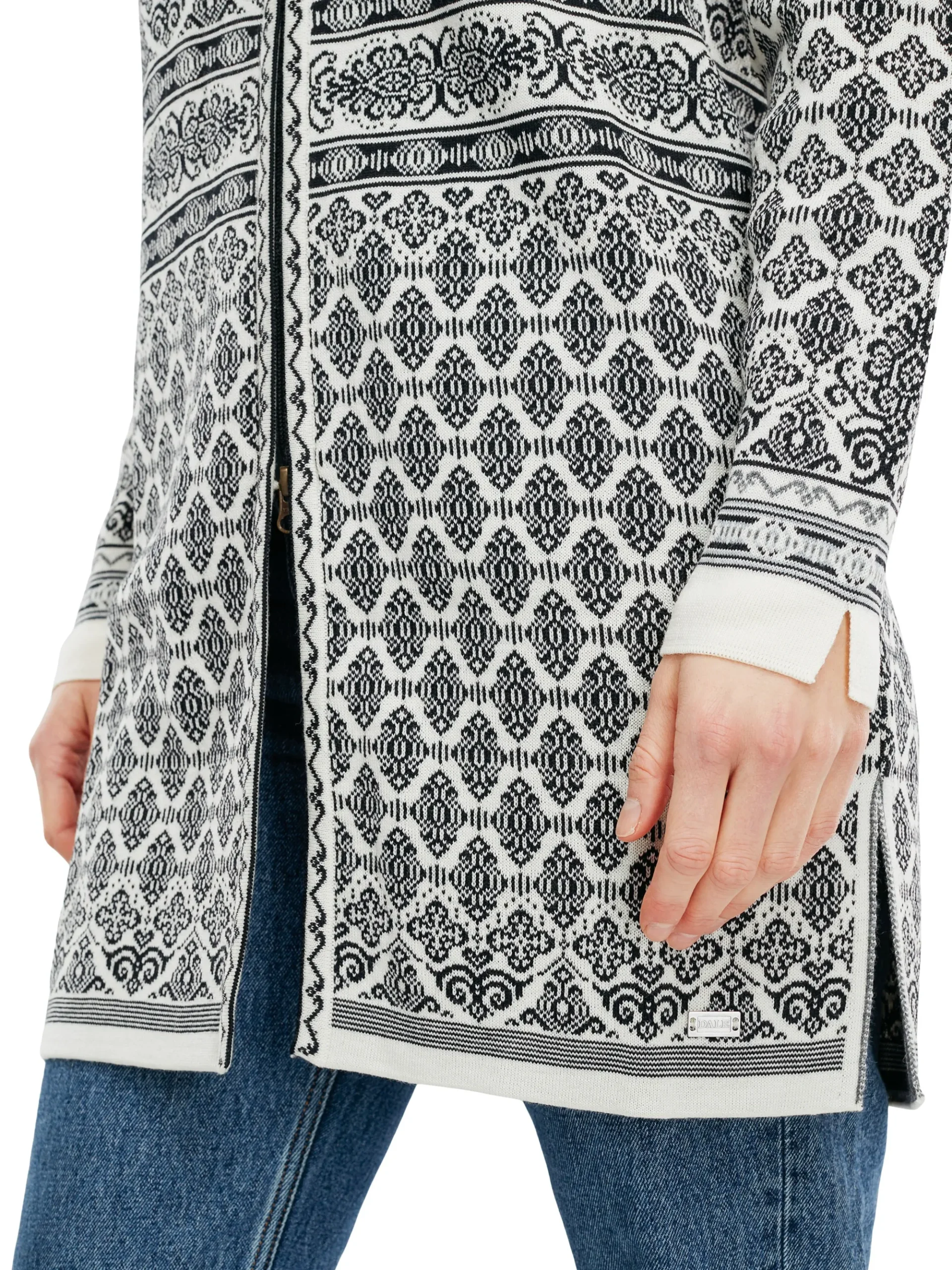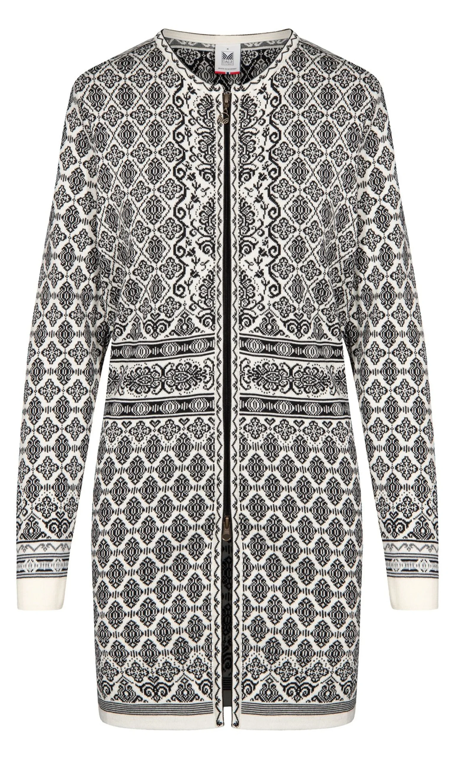 En Lang Og Komfortabel Jakke Med Los Passform Som Passer Kvinner I Alle Størrelser. Detaljerte Monstre Og Splitter I Sidene Tilforer Akkurat Passe Mengder Femininitet Til Denne Elegante Jakken. Strikket I 100% Myk Og Lett Merino-Ull I Svaert Holdbar Kvalitet.