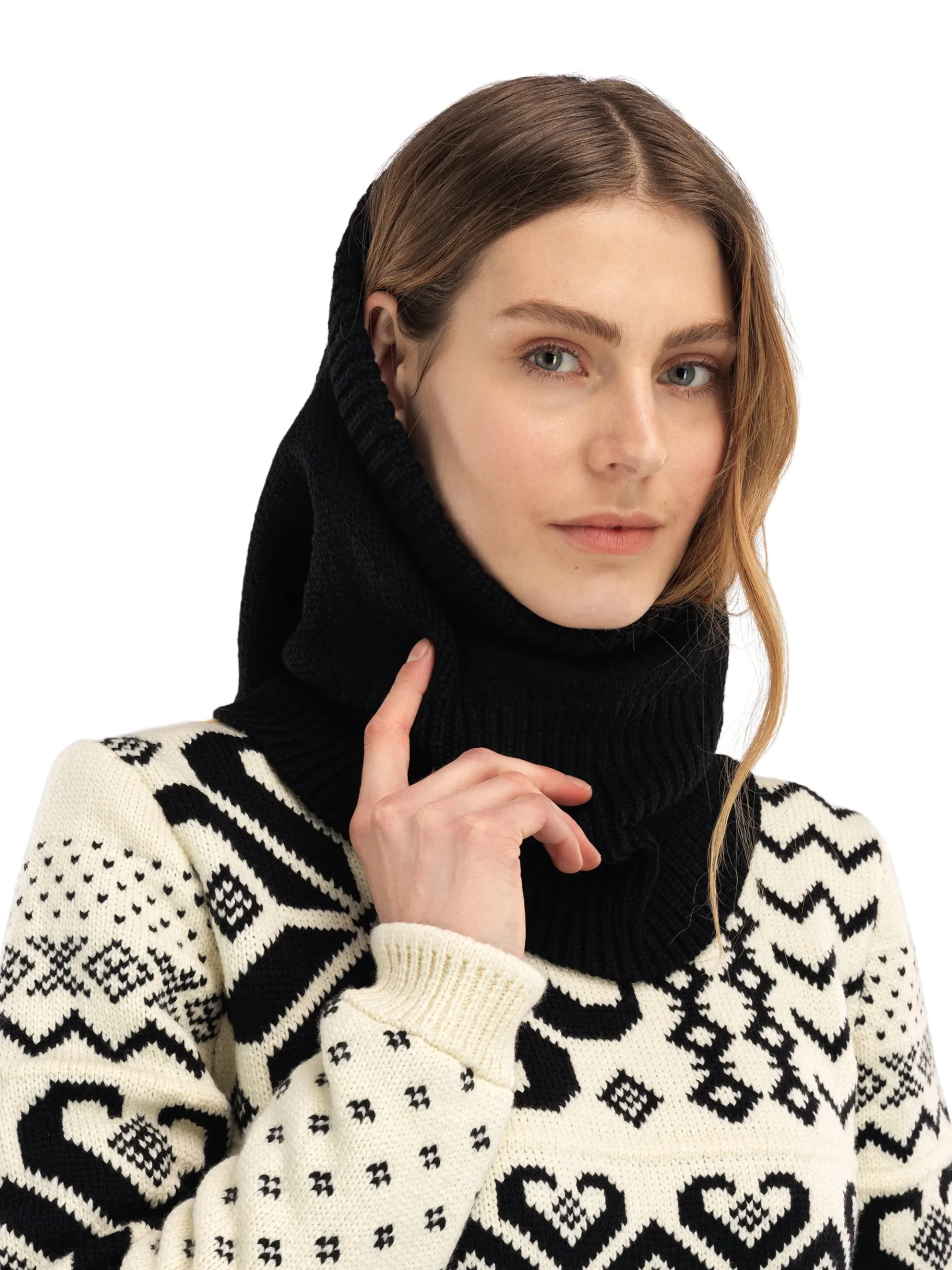 Myk Og Romslig Balaklava I Merino-Ull. Ribbestrikk Rundt Ansiktet Og Nederst Pa Halsen. Ekstra Volum Og God Lengde Pa Hals.