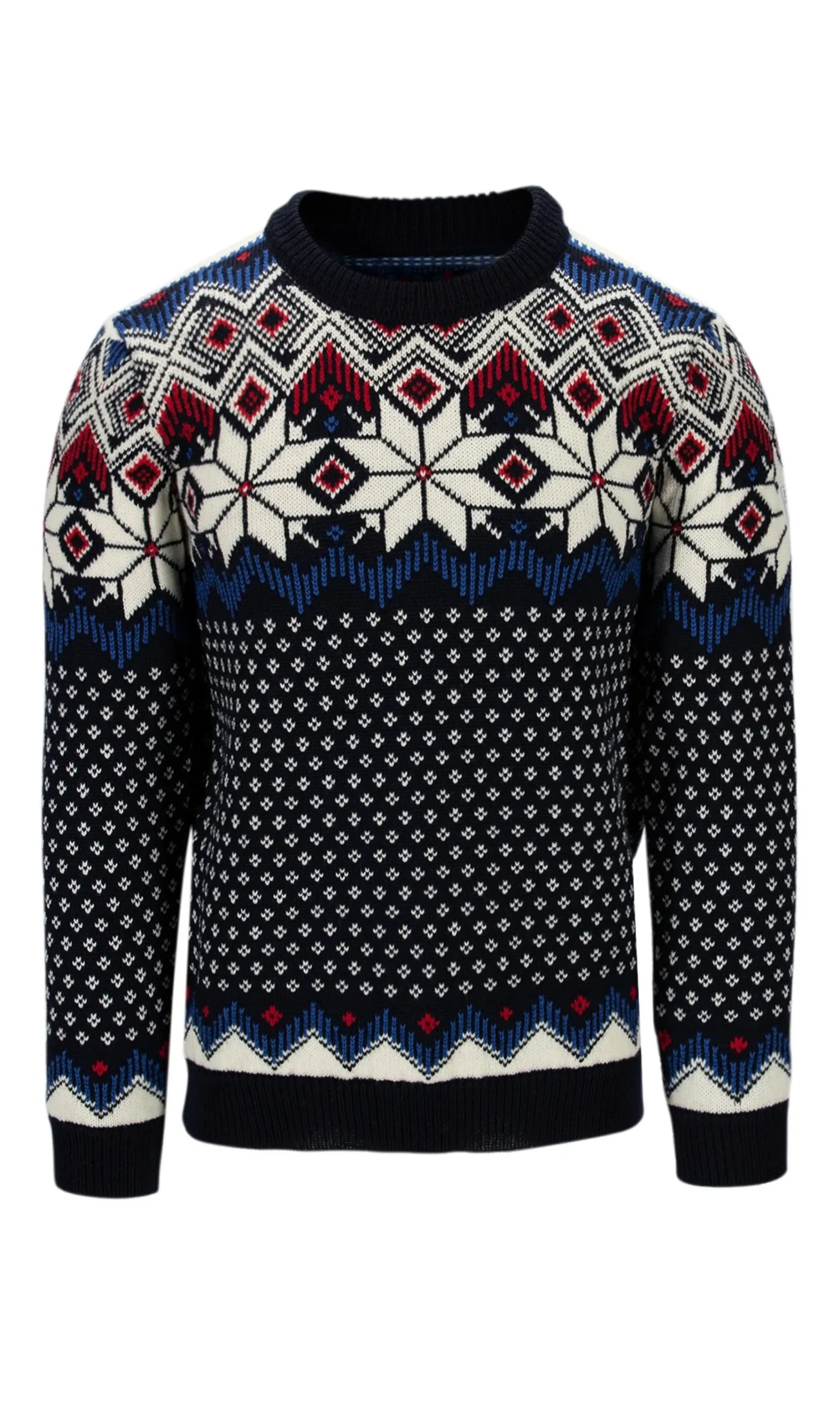 Designelementene Er Forstorret Og Bestar Av Den Klassiske Norske Attebladrosen, Korset Fra Setesdal- Og Cortinamonsteret, Samt Lusemonsteret. Genseren Er Strikket I 100% Ull Med Lang Holdbarhet.